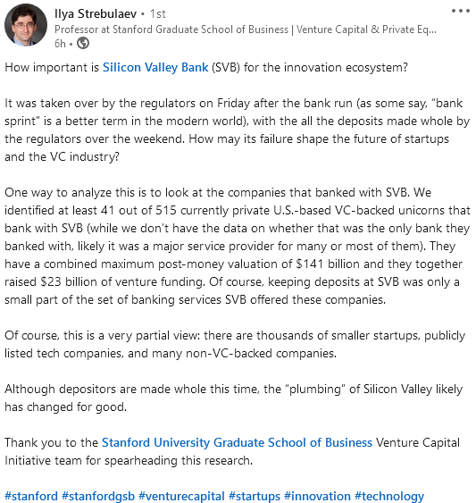 What's missed in all of this is that SVB was one of the largest conduits for all the money deployed to startups for decades. That capital was raised from institutional investors such as endowments, foundations, and retirement funds to invest in those startups. That cash belonged to their investors and it was held in the bank to pay startup expenses such as people's salaries.